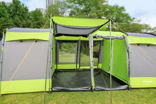 Tente de camping familiale 4 places - Spacieuse et confortable | 500 x 220 x 200 cm | Vert et gris | TRENDYFLAIR